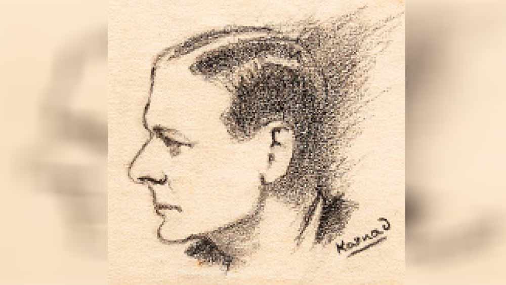 বম্বে বিশ্ববিদ্যালয়ে রাশিবিজ্ঞান ও গণিতের ছাত্র গিরিশ কারনাডকে টানত ‘ল্যান্ড অব টি এস এলিয়ট’, ভাবতেন, কবিতা নয়, অঙ্কের সুচর্চায় সে দেশে পৌঁছনো সহজ হবে। ইব্রাহিম আলকাজ়ির নাট্যক্ষেত্রে তরুণ কারনাড দেখেছেন চেকভ, ইবসেন, স্ট্রিন্ডবার্গ, পিরানদেল্লো, পরে রোডস স্কলারশিপ নিয়ে অক্সফোর্ডে গিয়ে শেক্সপিয়র, ব্রেশট। দিগন্ত খুলে-যাওয়া সেই শিল্পবোধের প্রেরণায় টি এস এলিয়ট (ছবিতে), আগাথা ক্রিস্টি-সহ বহু লেখক-চিন্তকের স্কেচ আঁকা শুরু করেন গিরিশ। এক তথ্যচিত্রের সূত্রে সেই সব স্কেচ নিয়ে গিরিশের সঙ্গে নিবিড় আলাপ করেছিলেন সুদেব সিংহ, স্কেচগুলি তাঁকে দেন শিল্পী স্বয়ং। সুদেবেরই রূপায়ণ-ভাবনায় এই প্রথম গিরিশের আঁকা স্কেচগুলি নিয়ে আন্তর্জালিক প্রদর্শনী শুরু হয়েছে শহরের ডিজিটাল শিল্প-পরিসর ‘আর্টওয়েভ ইন্ডিয়া’র ওয়েবসাইটে, ১৯ মে গিরিশের জন্মদিনে। সন্ধেয় ‘তাঁতঘর ফিল্মস’ ও ‘আর্টওয়েভ’-এর উদ্যোগে আলোচনায় ছিলেন বিভাস চক্রবর্তী, হিরণ মিত্র, দেবেশ চট্টোপাধ্যায়, রজতাভ দত্ত প্রমুখ।