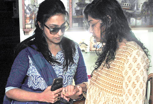 আবেশের মায়ের সঙ্গে ঋতুপর্ণা সেনগুপ্ত। মঙ্গলবার। —নিজস্ব চিত্র।