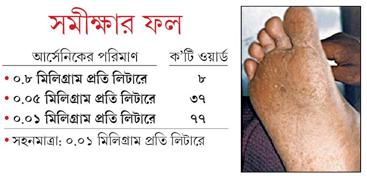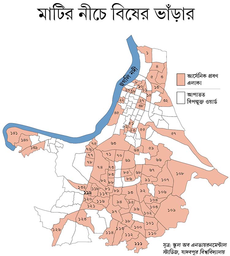 তবে যাদবপুর বিশ্ববিদ্যালয়ের ‘স্কুল অব এনভায়রনমেন্টাল স্টাডিজ’-এর একটি সমীক্ষা বলছে, দক্ষিণ শহরতলির বিস্তীর্ণ এলাকা আর্সেনিকপ্রবণ। আন্তর্জাতিক জার্নাল ‘কেমোস্ফিয়ার’-এ প্রকাশিত (অগস্ট ২০১৭) যাদবপুরের ওই গবেষণাপত্রে বলা হয়েছে, কলকাতা পুরসভার ৭৭টি ওয়ার্ডের নলকূপের জলে সহনমাত্রার (প্রতি লিটারে ০.০১ মিলিগ্রাম) বেশি আর্সেনিক মিলেছে। বাইপাস সংলগ্ন ৯৯ এবং ১০৫ ছাড়া বাকি সব ক’টি ওয়ার্ডকেই আর্সেনিকপ্রবণ হিসেবে চিহ্নিত করা হয়েছে ওই গবেষণাপত্রে।
