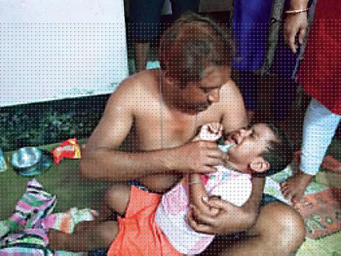 স্ত্রী মারা যাওয়ার পরে মশার দাপটের মধ্যেই সন্তানকে খাওয়াচ্ছেন লক্ষ্মণ সরকার। প্রমোদগড়ে।