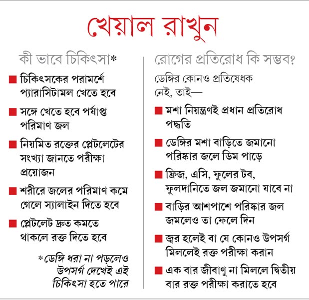 হাসপাতালে বেশ কিছু দিন থাকার পরে বাড়ি ফিরেছেন ওই ব্যক্তি। জনে জনে এখন তিনি বলছেন, ‘‘ডেঙ্গি প্রবণ এলাকায় বর্ষার সময়টায় জ্বর হলে সঙ্গে সঙ্গেই রক্ত পরীক্ষা করাতে হয়। রক্ত পরীক্ষা ছাড়া কোনও মতেই ওষুধ খাওয়া মানা। আর অ্যান্টিবায়োটিক তো একেবারেই নিষিদ্ধ।’’