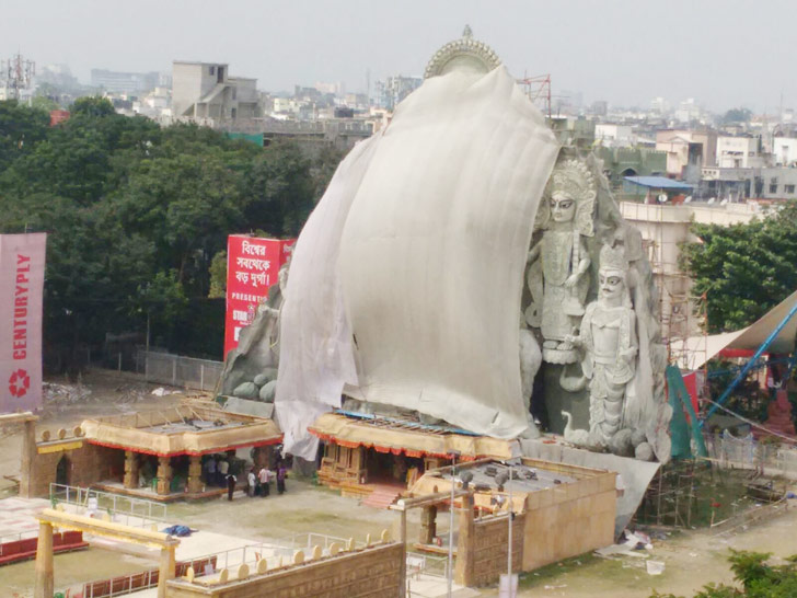 কেউ কেউ পিছনের দিকের ব্যারিকেডের ফাঁক দিয়ে দেখার চেষ্টা করেছিলেন। ভিড় জমে যাচ্ছে দেখে পুলিশ সেখান থেকে দর্শনার্থীদের সরিয়ে দেয়। পরে বিকেলের দিকে পার্কের ওই দিকটায় বাঁশ পুঁতে কাপড় টানিয়ে দেওয়ার ব্যবস্থা করা হয়। যাতে বাইরে থেকে কোনও ভাবেই দেখা না যায় ৮৮ ফুটের দুর্গা। পুলিশের নির্দেশে ঢেকে দেওয়া হয় গোটা প্রতিমাকে। কিন্তু, বেলার দিকে হঠাত্ই দেখা যায় মূর্তির আচ্ছাদন সরে গিয়েছে। খবরটা রটে যায়। ফের দর্শনার্থীরা পাড়ি দিতে থাকেন দেশপ্রিয়র উদ্দেশে। শোনা যায়, পুলিশ না কি প্রতিমা দর্শনে নিষেধাজ্ঞা তুলে নিয়েছে। পরে জানা যায়, পুলিশ কোনও নিষেধাজ্ঞা তোলেনি। পুজো উদ্যোক্তারা ঢাকা খুলে দিয়েছেন ব্যাপারটা তা নয়, হাওয়ার কারণেই প্রতিমার আচ্ছাদন সরে গিয়েছিল।