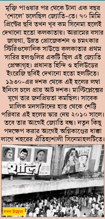 সিনেমা হলটা বছর আটেক আগে বন্ধ হয়ে গেলেও এখনও ওখানে বাসস্টপ সেই নামে। আবার, হল না থাকলেও দোতলা বাড়িটা ছিল। ওটাই বহু বছর ধরে ল্যান্ডমার্ক বা পথ-নির্দেশক। শনিবার গভীর রাতে ধর্মতলার লেনিন সরণিতে পুড়ে ছাই হয়ে গেল জ্যোতি সিনেমার সেই বাড়িও।