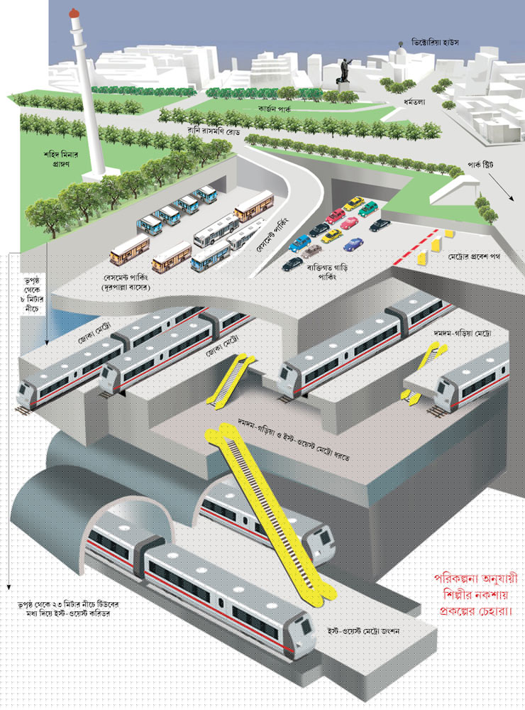 ইস্ট-ওয়েস্ট, নর্থ-সাউথ এবং জোকা-বি বা দী বাগ মেট্রো প্রকল্পের একমাত্র জংশন হবে এসপ্ল্যানেড। তাই, গুরুত্ব বাড়ছে এসপ্ল্যানেড স্টেশনের। রাজ্য সরকার এবং মেট্রো রেল-কর্তৃপক্ষ ঠিক করেছেন, লন্ডনের কিঙ্গস ক্রস-এর ধাঁচে বড় স্টেশন চত্বর তৈরি হবে এসপ্ল্যানেডে। ইতিমধ্যেই এসপ্ল্যানেডে ওই স্টেশন তৈরির জন্য সেনার হাত থেকে জমি রাজ্য ও মেট্রো রেলের হাতে তুলে দেওয়ার নীতিগত সিদ্ধান্ত হয়ে গিয়েছে। তার পরেই শুরু হয়ে গিয়েছে পরিকল্পনা। প্রাথমিক একটি পরিকল্পনার নকশা তৈরি করেছে রাইটস। ঠিক হয়েছে, পুরো স্টেশন প্রকল্পই হবে মাটির তলায়। তিনটি মেট্রো রুটের স্টেশন হবে মাটির নীচে তিনটি পৃথক স্তরে।