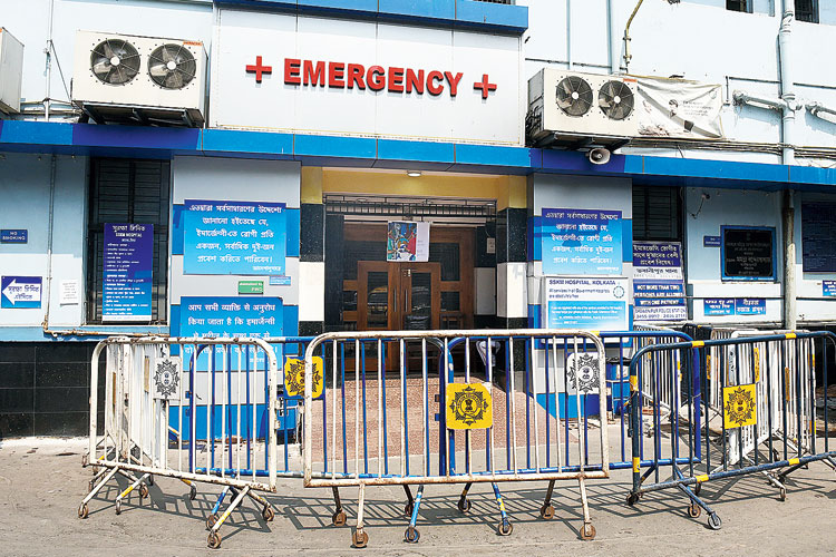 রুদ্ধ: এসএসকেএমের ইমার্জেন্সির সামনে ব্যারিকেড। বুধবার। ছবি: রণজিৎ নন্দী