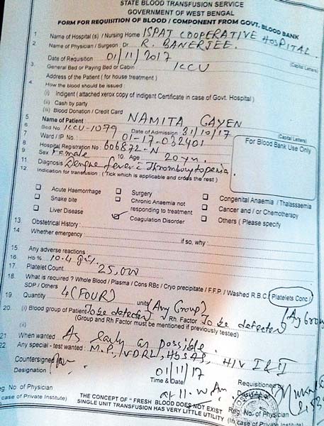 নমিতা গায়েনের রক্তের রিকুইজিশন স্লিপে, অসুখের নাম হিসেবে স্পষ্ট লেখা রয়েছে ডেঙ্গি। নিজস্ব চিত্র