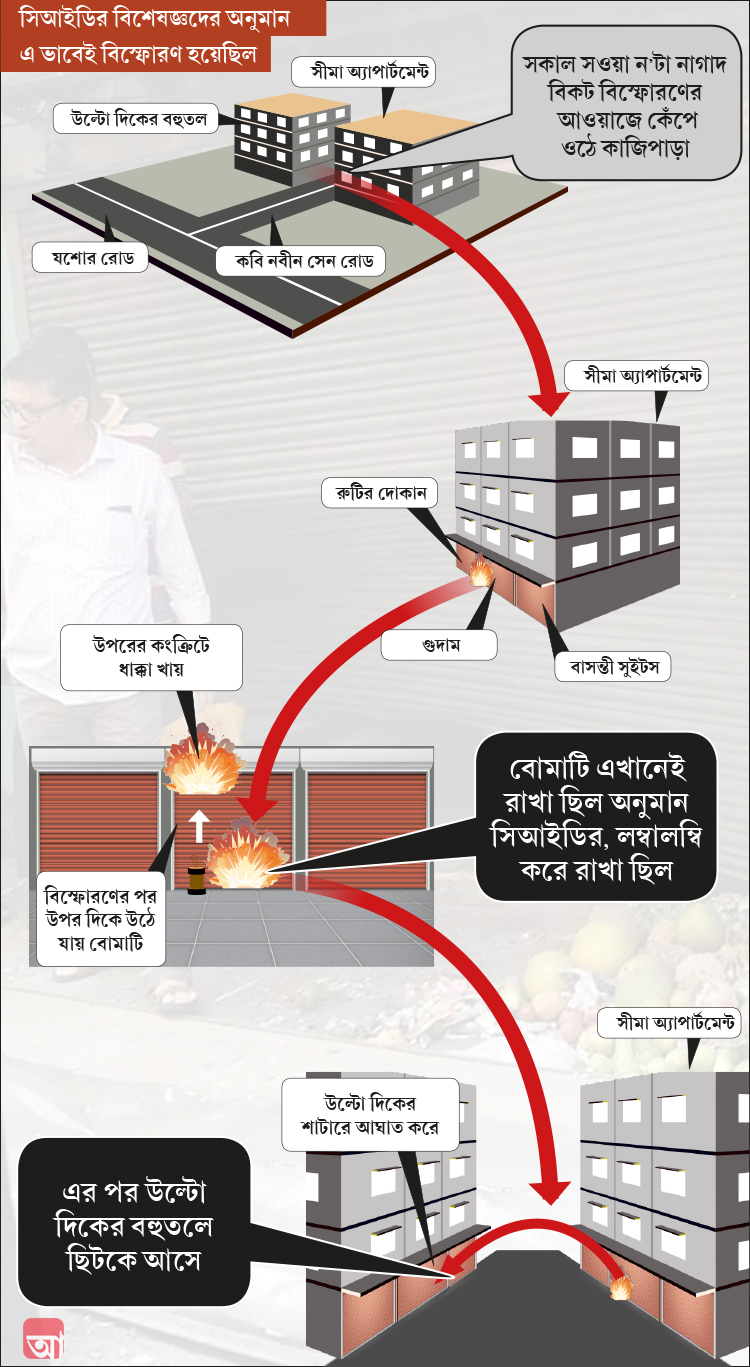 প্রথমে একটা বিকট আওয়াজ। তারই সঙ্গে ঝনঝন করে ভেঙে পড়ল দরজা-জানলার কাচ। শুধু সীমা অ্যাপার্টমেন্টেরই নয়, আশপাশের প্রায় তিন-চারটি বাড়িরই একই হাল বিস্ফোরণের অভিঘাতে।তার তীব্রতা এতটাই ছিল, সীমা অ্যাপার্টমেন্টের একতলায় যেখানে বিষ্ফোরণ হয়েছে, তার ঠিক উপরে কংক্রিটের কার্নিশের একটা অংশ ভেঙে গিয়েছে।উল্টো দিকের একটি দোকানের শাটারওতুবড়ে ঢুকে গিয়েছেঅনেকটা।