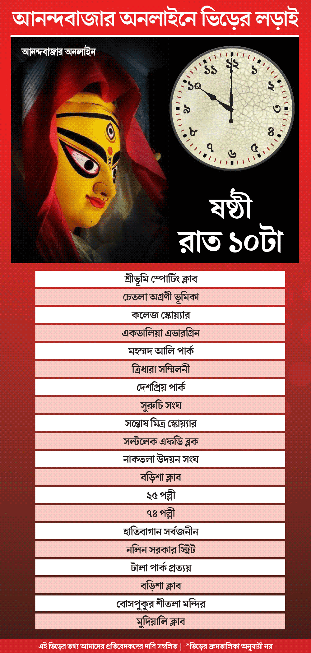 হাওয়া অফিসের পূর্বাভাস ছিল ষষ্ঠীর রাত বৃষ্টিতে ভিজবে। তবে তাতে মণ্ডপ ও প্রতিমা দর্শন দেখায় কোনও বিরাম নেই। বৃষ্টির মধ্যে পুজো মণ্ডপের সামনে অপেক্ষা করতে দেখা গেল প্রচুর দর্শনার্থীকে। জল থইথই কলকাতার রাস্তায় দেখা গেল এই একই ছবি। কয়েকটি প্যান্ডেল প্রচুর দর্শক টেনেছে। সেই তালিকায় যেমন মন্ত্রী সুজিত বসুর শ্রীভূমি স্পোর্টিং ক্লাব আছে। তেমন রয়েছে প্রয়াত মন্ত্রী সুব্রত মুখোপাধ্যায়ের নাম জড়িয়ে থাকা একডালিয়া এভারগ্রিনও।