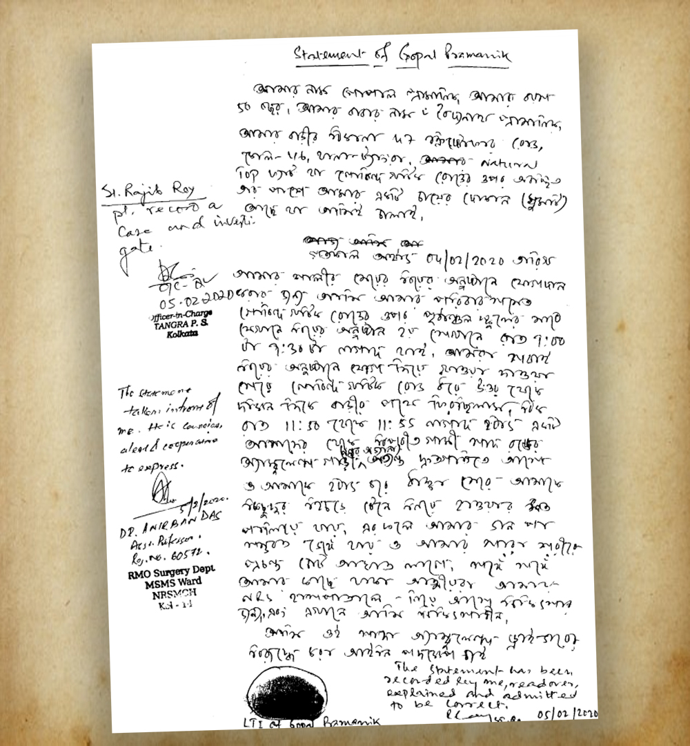 পুলিশ সূত্রে খবর, গুরুতর আহত অবস্থায় ওই প্রৌঢ়কে এনআরএস মেডিক্যাল কলেজ হাসপাতালে নিয়ে যাওয়া হয়। সেখানকার এমএসএমএস ওয়ার্ডে ভর্তি করা হয়। ওই ওয়ার্ডের দায়িত্বে থাকা রেসিডেন্ট মেডিক্যাল অফিসার অনির্বাণ দাসের সামনে বয়ানও দেন ওই প্রৌঢ়। সেই জবানবন্দিতে তিনি জানিয়েছেন, ‘‘বিয়ের অনুষ্ঠান শেষে মঙ্গলবার (৪ ফেব্রুয়ারি,২০২০) রাত ১১টা ৫০ থেকে ১১টা ৫৫-র মধ্যে গোবিন্দ খটিক রোড ধরে বাড়ি ফিরছিলেন তিনি। সেই সময় উল্টো দিক থেকে আসা একটি সাদা রঙের অ্যাম্বুল্যান্স আচমকাই তাঁকে ধাক্কা মেরে কিছুটা দূর পর্যন্ত হিঁচড়ে নিয়ে যায়। এর পর গাড়িটি পালিয়ে যায়। ডান পায়ে গুরুতর আঘাত লাগে তাঁর।”
