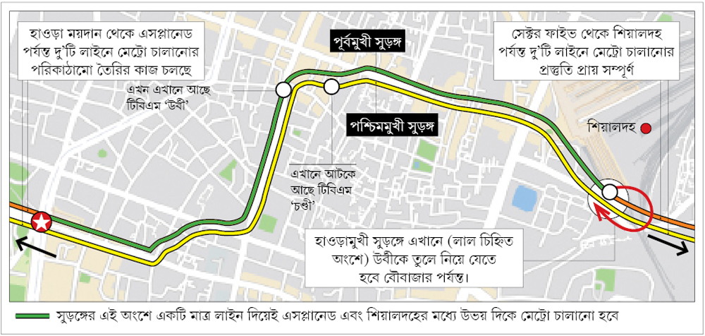 ভবিষ্যতে যাত্রী-সংখ্যার কথা ভেবে এসপ্লানেড এবং শিয়ালদহ— এই দুই স্টেশনেই তিনটি করে প্ল্যাটফর্মের ব্যবস্থা রয়েছে। ফলে দু’প্রান্তের মধ্যে এক দিকের ট্রেনকে কয়েক মিনিট দাঁড় করিয়ে রেখে পর্যায়ক্রমে দু’দিকেই ট্রেন চালানো সম্ভব বলে জানাচ্ছেন মেট্রোকর্তারা। তবে সে জন্য এসপ্লানেড থেকে শিয়ালদহ পর্যন্ত ২.৪৫ কিলোমিটার দূরত্বের মধ্যে পূর্বমুখী সুড়ঙ্গের কাজ সম্পূর্ণ করতেই হবে। মেট্রো সূত্রের খবর, পশ্চিমমুখী সুড়ঙ্গে বিপর্যয়ের পরে টানেল বোরিং মেশিন ‘চণ্ডী’কে তুলে আনা যায়নি। এই অবস্থায় লকডাউন পরিস্থিতি শেষ হলে পূর্বমুখী সুড়ঙ্গের কাজ নির্বিঘ্নে শেষ করাটাই মেট্রো কর্তৃপক্ষের কাছে সব চেয়ে বড় চ্যালেঞ্জ। ওই কাজ শুরু করার প্রস্তুতি চলছে। পূর্বমুখী সুড়ঙ্গের কাজ সম্পূর্ণ হলে শিয়ালদহে টিবিএম ‘উর্বী’কে ফের তুলে পশ্চিমমুখী সুড়ঙ্গে বসিয়ে বৌবাজার পর্যন্ত দ্বিতীয় সুড়ঙ্গের কাজ শেষ করা হবে। পরে বৌবাজার থেকেই ‘চণ্ডী’ এবং ‘উর্বী’কে মাটির নীচ থেকে তুলে আনা হবে।