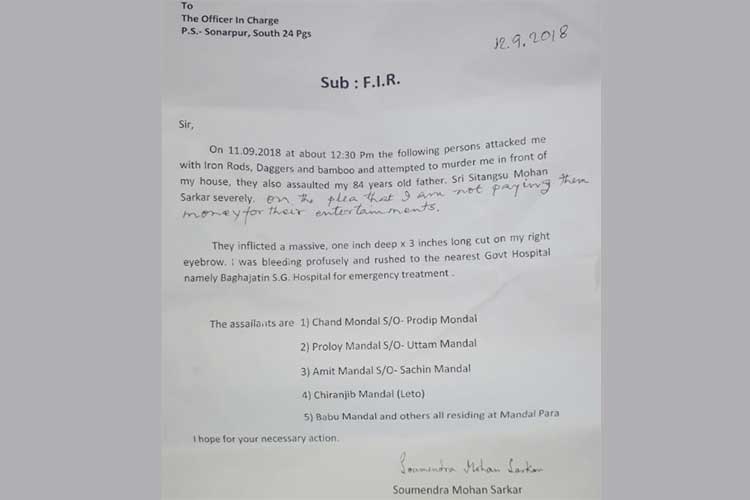 বুধবার সকালে সোনারপুর থানায় অভিযোগ জানাতে যান সীতাংশুবাবু। তাঁর অভিযোগ, পুলিশ গোটা বিষয়টিকে আদৌ গুরুত্ব দেয়নি। প্রথমে অভিযোগ নিতেই অস্বীকার করে। পরে জেনারেল ডায়েরি করে রাখে। সৌমেন্দ্রবাবুর অভিযোগ, “ওই যুবকদের মারে আমার মাথা ফেটে যায়। রক্ত ঝরতে থাকে। চিকিৎসার জন্য আমাকে বাঘাযতীন এস জি হাসপাতালে নিয়ে যাওয়া হয়।” ওই পরিবারের দাবি, চাঁদ মণ্ডল, প্রলয় মণ্ডল অমিত মণ্ডল, চিরঞ্জীব মণ্ডল ওরফে লেটো, বাবু মণ্ডল-সহ মণ্ডলপাড়ার বেশ কয়েক জন তাঁদের উপর হামলা চালিয়েছেন।