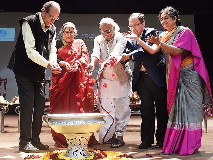 সবে মিলে: প্রেসিডেন্সির ২০১তম প্রতিষ্ঠা দিবসের অনুষ্ঠানে (বাঁ দিক থেকে) জয়ন্ত মিত্র, নবনীতা দেবসেন, শঙ্খ ঘোষ, সুগত বসু এবং অনুরাধা লোহিয়া। শনিবার। ছবি: বিশ্বনাথ বণিক।