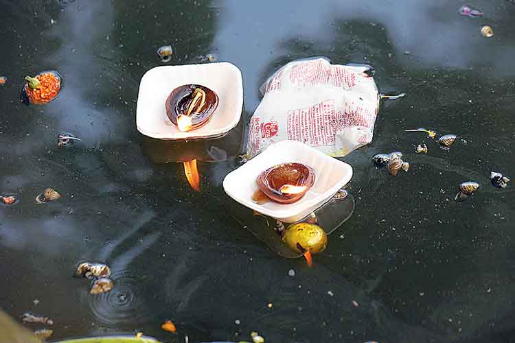 জলে ভাসছে পুজোর উপচার এবং প্লাস্টিক।