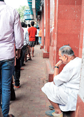 বয়স বাড়ার সঙ্গেই বেড়েছে দুশ্চিন্তার অভ্যাস। টাকা বদলের জন্য আগামী ৪৯ দিন কি আর অপেক্ষা করা যায়? সকাল-সকাল তাই রাষ্ট্রায়ত্ত ব্যাঙ্কের সামনে। বহু প্রবীণ মানুষের পেনশন অ্যাকাউন্ট সেখানেই। ফলে মাসের প্রথমে যাঁরা টাকা তুলেছিলেন, মঙ্গলবার নোট অচল হয়ে যেতেই বিপদে পড়েছেন তাঁরা। লেক গার্ডেন্সের বাসিন্দা ৭০ বছরের দেবাশিস চক্রবর্তী যেমন। বললেন, ‘‘পেনশনের টাকাই ভরসা। সেগুলো সময়ে হাতে না পেলে ভাত জোটানোই মুশকিল হয়ে যাবে। তাই আর দেরি করিনি। আজই চলে এসেছি।’’