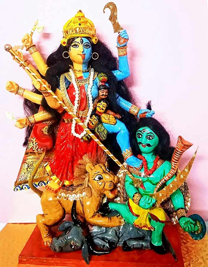 সাকুল্যে ইঞ্চি ছয় উচ্চতা। এতটুকু দুর্গাঠাকুর, নতজানু মহিষাসুর সেই অনুপাতেই ছোট, দুর্গার বাহন সিংহও। অথচ প্রত্যেকেই ছুঁয়েছে অনুপম শিল্পসুষমা। দুর্গার দিকে তাকালে আবার দেখা যাবে তাঁর একটি অংশ শ্যামবর্ণা, মুণ্ডমালিনী কালী— একটি মুঠিতে তিনিই ধরে আছেন মহিষাসুরের উদ্ধত কেশগুচ্ছ! বনহুগলির রাইমোহন ব্যানার্জি রোডের বাসিন্দা হরিসাধন বিশ্বাস প্রতি বছর পুজোর আগে একটি ছোট্ট ঠাকুর গড়েন, পুজোর হুল্লোড়ে প্রদর্শনের জন্য নয়, আপন আনন্দে— এ বার গড়েছেন এটি (ছবি)। চার পাশের অশুভের বিনাশে এই দুর্গাকালী রূপেরই আবাহন জরুরি মনে হয়েছে তাঁর, সেই ভাবনাই রূপ পেয়েছে মাটি আর অ্যাক্রিলিক রঙের যুগলবন্দিতে। ২০০৪ সাল থেকে চলছে এই চর্চাটি, এক-এক বছর এক-এক অভাবনীয় উপকরণে: নানা ফুলের পাপড়ি ও বীজ, পেঁয়াজ-রসুনের খোসা, গ্যাসের পাইপ ও তারের টুকরো দিয়ে, এমনকি আনন্দবাজার পত্রিকা খবরকাগজ দিয়েও। বাড়িটিই ওঁর সংগ্রহশালা।