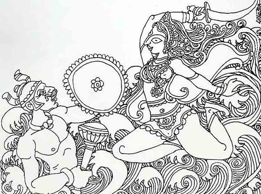 দেবী দুর্গাকে নিয়ে কাহিনির যেমন শেষ নেই, তেমনই সেগুলিতে তাঁর রূপবর্ণনারও অন্ত নেই। এক কথায় তিনি বহুরূপিণী। দেবীর নানা রূপ বাঙালির শাস্ত্রে আচারে মানসপটে বহুকাল ধরে প্রচলিত— প্রাচীন কাল থেকেই সেই রূপকে কেন্দ্র করে নির্মিত হয়েছে ভাস্কর্য, আঁকা হয়েছে কতশত ছবি। যেমন, তিনি কখনও শস্যদায়িনী, কখনও মহিষাসুরমর্দিনী বা অসুরনাশিনী, কখনও সিংহবাহিনী, আবার কখনও চামুণ্ডা বা চণ্ডীরূপী। দেবীর এহেন বহুরূপ ফুটে উঠেছে শিল্পী দেবাশীষ মল্লিক চৌধুরীর রেখাচিত্রে। তাঁর আঁকা দেবীর বিভিন্ন রূপের পঞ্চাশটি চিত্রকৃতি নিয়ে ‘দুর্গতিনাশিনী’ প্রদর্শনী শুরু হয়েছে গতকাল, অ্যাকাডেমি অব ফাইন আর্টসে। চলবে ২৫ সেপ্টেম্বর পর্যন্ত, বিকেল ৩টে থেকে রাত ৮টা। ছবিতে তারই একটি, প্রচারপত্র থেকে।