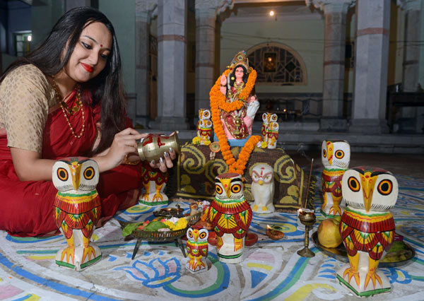 উত্তর কলকাতায় একটি বাড়িতে লক্ষ্মীপুজোর প্রস্তুতি। ছবি: রণজিত্ নন্দী।