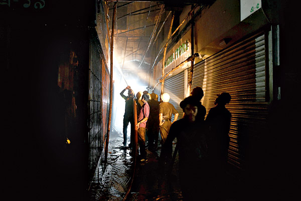 দিনের বেচাকেনা শেষ। নিউ মার্কেট তখন বন্ধ হয়ে গিয়েছে। পসরা গোটাতে ব্যস্ত এলাকার হকারেরাও। হঠাৎই তাঁরা দেখতে পান, ঝাঁপ-বন্ধ একটি দোকানের ভিতর থেকে গলগলিয়ে ধোঁয়া বেরোচ্ছে। আতঙ্ক ছড়িয়ে পড়ে বৃহস্পতিবার রাত তখন পৌনে ৯টা। চলে আসে দমকলের ১০টি ইঞ্জিন। প্রথমে নিউ মার্কেটের একটি কোলাপসিবল গেটের তালা ভাঙেন দমকলকর্মীরা। তার পরে ভিতরে ঢুকে শুরু করেন আগুন নেভানোর কাজ।
