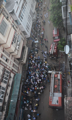লালবাজারের এক কর্তা জানান, ছুটির দিন হলেও ওই বাড়িতে কেউ আটকে থাকতে পারেন, এই আশঙ্কায় ঘটনাস্থলে পাঠানো হয় বিপর্যয় মোকাবিলা দলকে। মোতায়েন করা হয় অ্যাম্বুল্যান্স। কিন্তু দমকলের অফিসারেরা চার তলায় উঠে সরেজমিনে খতিয়ে দেখে পুলিশকে জানান, বাড়িতে কেউ আটকে নেই।