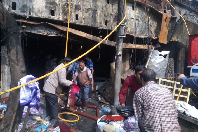 আগুন নিয়ন্ত্রণে আসার পর দোকান থেকে বের করা হচ্ছে পুড়ে যাওয়া কাপড়।