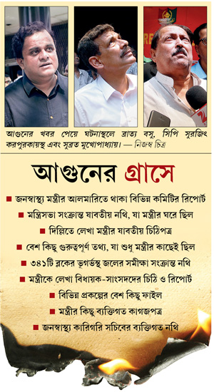 আগুন লাগার খবর পেয়েই ঘটনাস্থলে যান সুব্রতবাবু। তিনি এক বার সিঁড়ি দিয়ে উপরে ওঠার চেষ্টাও করেন। তবে ধোঁয়ার জন্য এক তলার বেশি এগোতে না পেরে ফিরে আসেন। জানান, সাধারণত তাঁর দফতরের কর্মীরা একটু দেরি করে অফিসে আসেন। তিনি নিজেও বেলার দিকে আসেন। ফলে এ দিন ঘটনার সময় তাঁর দফতরে প্রায় কেউ উপস্থিত ছিলেন না। তবে বিস্তর ক্ষয়ক্ষতির আশঙ্কা করছেন তিনি। মন্ত্রী বলেন, ‘‘প্রচুর গুরুত্বপূর্ণ নথিপত্র ছিল দফতরের বিভিন্ন ঘরে। আগুনের পর তার কী অবশিষ্ট থাকবে তাই ভাবছি।’’ রাতে অবশ্য তিনি বলেন, ‘‘আমার ও সচিবের ঘরে আগুন লাগলেও কোনও নথি নষ্ট হয়নি। কারণ, সে সব ছিল দফতরের অন্য ঘরে।’’ তাঁর দফতর ও দমকল সূত্রের অবশ্য দাবি, বিধ্বংসী আগুনে মন্ত্রী ও আমলার ঘরের কিছু গুরুত্বপূর্ণ কাগজ ও ফাইল পুড়ে যাওয়ার আশঙ্কা রয়েছে।