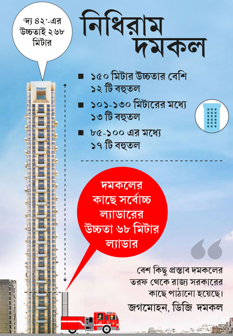 সম্প্রতি চৌরঙ্গিতে ‘দ্য ৪২’ বহুতলে আগুন লাগার পর দমকলের বেহাল দশা আরও স্পষ্ট হয়েছে। এখনও পর্যন্ত কলকাতার সর্বোচ্চ বহুতল ‘দ্য ৪২’— ৬৩ তলা। নির্মীয়মাণ বলেই সে দিন ক্ষয়ক্ষতি তেমন হয়নি ওই বহুতলে। কিন্তু বসবাস শুরু হওয়ার পর যদি ওই আগুন লাগত? তা হলে কী ভাবে তার মোকাবিলা করত দমকল? এই সব প্রশ্নের সমাধান চাইছে খোদ দমকলের কর্তারাও।