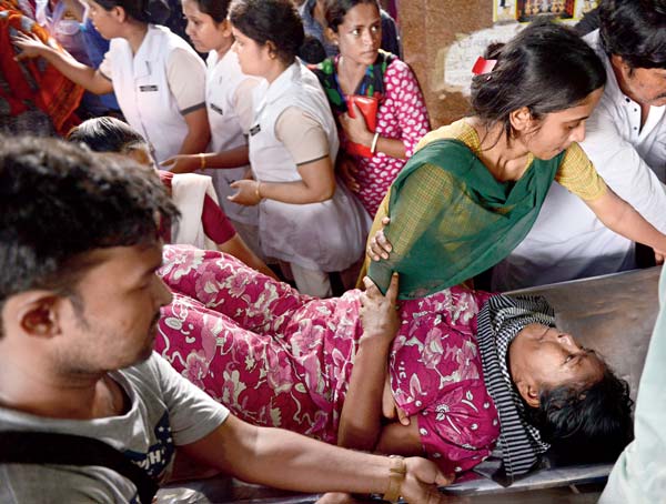 একা নেমে আসা রোগীকে ট্রলিতে তুলে নিয়ে যাচ্ছেন হাসপাতালের কর্মীরা।