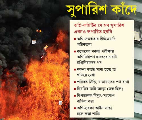দমকলমন্ত্রী জাভেদ খান জানান, দমকলের নিয়মে বলা আছে চারতলার বেশি উঁচু (জি+৪) বাড়ির ক্ষেত্রে অগ্নিবিধি মেনে চলতেই হয়। বর্তমানে শহরে প্রায় ৮ লক্ষ তেমন বাড়ি রয়েছে। তিনি বলেন, “সব বাড়ি অগ্নিবিধি মেনে চলছে কি না, তা দেখা খুবই শক্ত কাজ। নিজেদের সুরক্ষায় বাড়ির বাসিন্দাদেরও এ ব্যাপারে সজাগ হওয়া দরকার।”