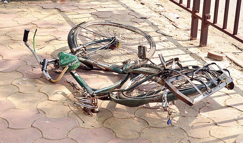 এই সাইকেল থেকেই ছিটকে পড়ে জখম হয় ছোট্ট শ্রাবন্তী। সোমবার, লাবণিতে। নিজস্ব চিত্র