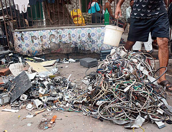 দূষণনামা: চাঁদনি চকে রাস্তায় ডাঁই হয়ে পড়ে বৈদ্যুতিন বর্জ্য।