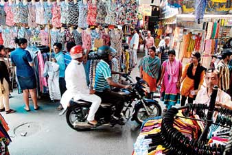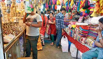 ফলে রাসবিহারী অ্যাভিনিউ ধরে গড়িয়াহাট পর্যন্ত দু’ধারের ফুটপাথের একাংশ দিনে-দুপুরেই প্রায়ান্ধকার জঙ্গলে পরিণত। প্লাস্টিক ছাওয়া পথে পরপর চুড়ি-হার-দুল-ক্লিপের পসরা সাজানো। কিংবা মাথার উপরে ঝুলন্ত পোশাক-ব্যাগ-বেল্ট-অন্তর্বাসের ঝুরি নামছে। টুলের সিংহাসনে বসে খোশমেজাজে কারবার চালাচ্ছেন ‘পথের বাদশা’রা।