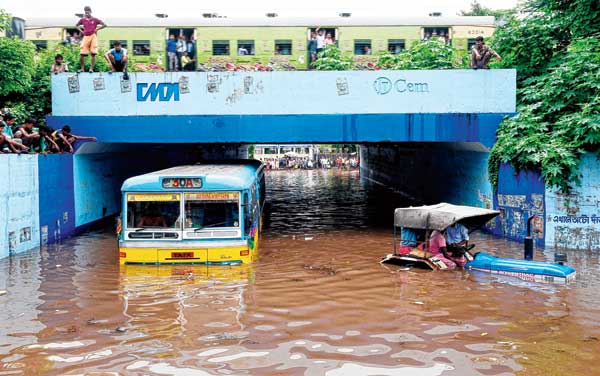 বৃহস্পতিবার রাত থেকে শুক্রবার। টানা বৃষ্টিতে এ বার আর শুধু দক্ষিণ নয়, প্রায় গোটা কলকাতারই বিভিন্ন রাস্তা চলে গেল প্রায় এক থেকে চার ফুট জলের তলায়। পুরসভা সূত্রের খবর, মাত্র কয়েক ঘণ্টায় ১৪০-১৬০ মিলিমিটার বৃষ্টি হওয়ায় পরিস্থিতি ভয়াবহ আকার নিয়েছে। এমনকী, জলের তোড়ে ভেসে গিয়ে মধ্য কলকাতার মুক্তারামবাবু স্ট্রিটে মারা গিয়েছে ফুটপাথবাসী মাস ছয়েকের এক শিশুও। উত্তরে সিঁথি থেকে শুরু করে ঠনঠনিয়া, চিত্তরঞ্জন অ্যাভিনিউ, নারকেলডাঙা মেন রোড, মুক্তারামবাবু স্ট্রিট, সুকিয়া স্ট্রিট, রামমোহন সরণি, দক্ষিণে পঞ্চাননতলা রোড, বালিগঞ্জ প্লেস, কসবা, সদানন্দ রোড, গল্ফগ্রিন, যোধপুর পার্ক, বেহালার বেশ কিছু এলাকা-সহ বাইপাসের ধারে পঞ্চান্নগ্রাম, মুকুন্দপুর, বুধেরহাট, ভগত সিংহ কলোনি, গার্ডেনরিচ, মেটিয়াবুরুজ-সহ শহরের অনেক ওয়ার্ডই জলমগ্ন।