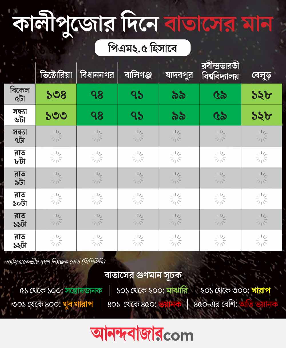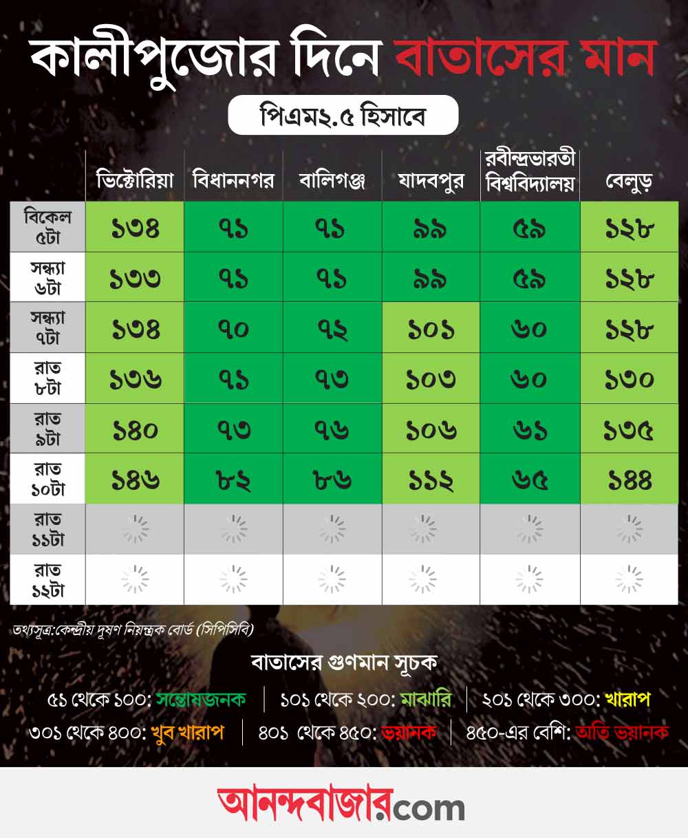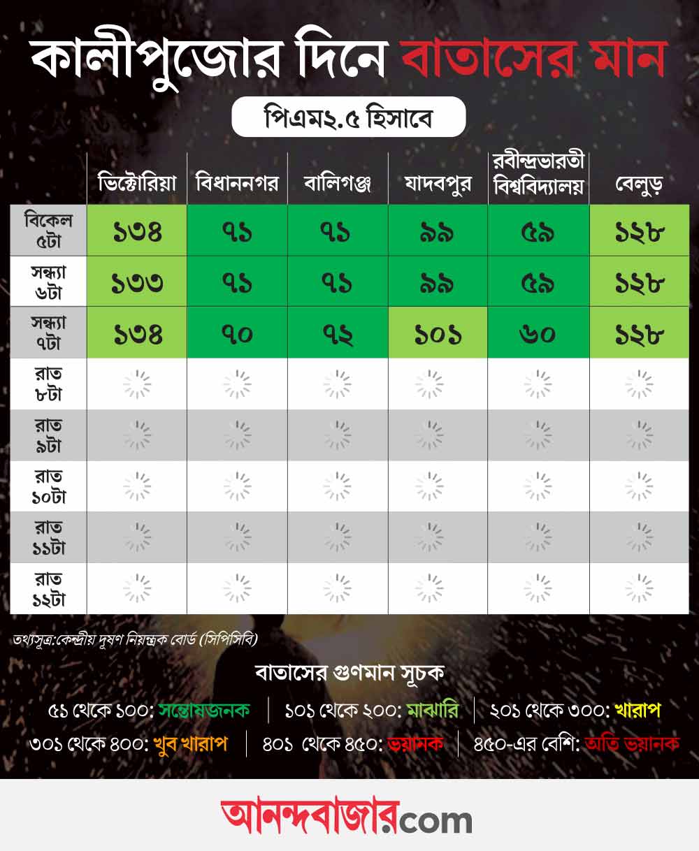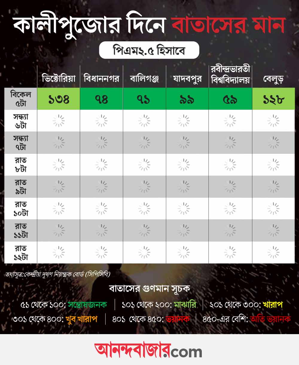 কালীপুজোয় রাত বৃদ্ধির সঙ্গে সঙ্গে বাজির দাপট বাড়ছে। কলকাতার দুই জায়গা এবং বেলুড়ের বাতাসের মান ‘মাঝারি’। বাকি জায়গার বাতাসের গুণগত মান ‘সন্তোষজনক’ পর্যায়েই রয়েছে। কোথায়, কেমন— রইল তালিকা।