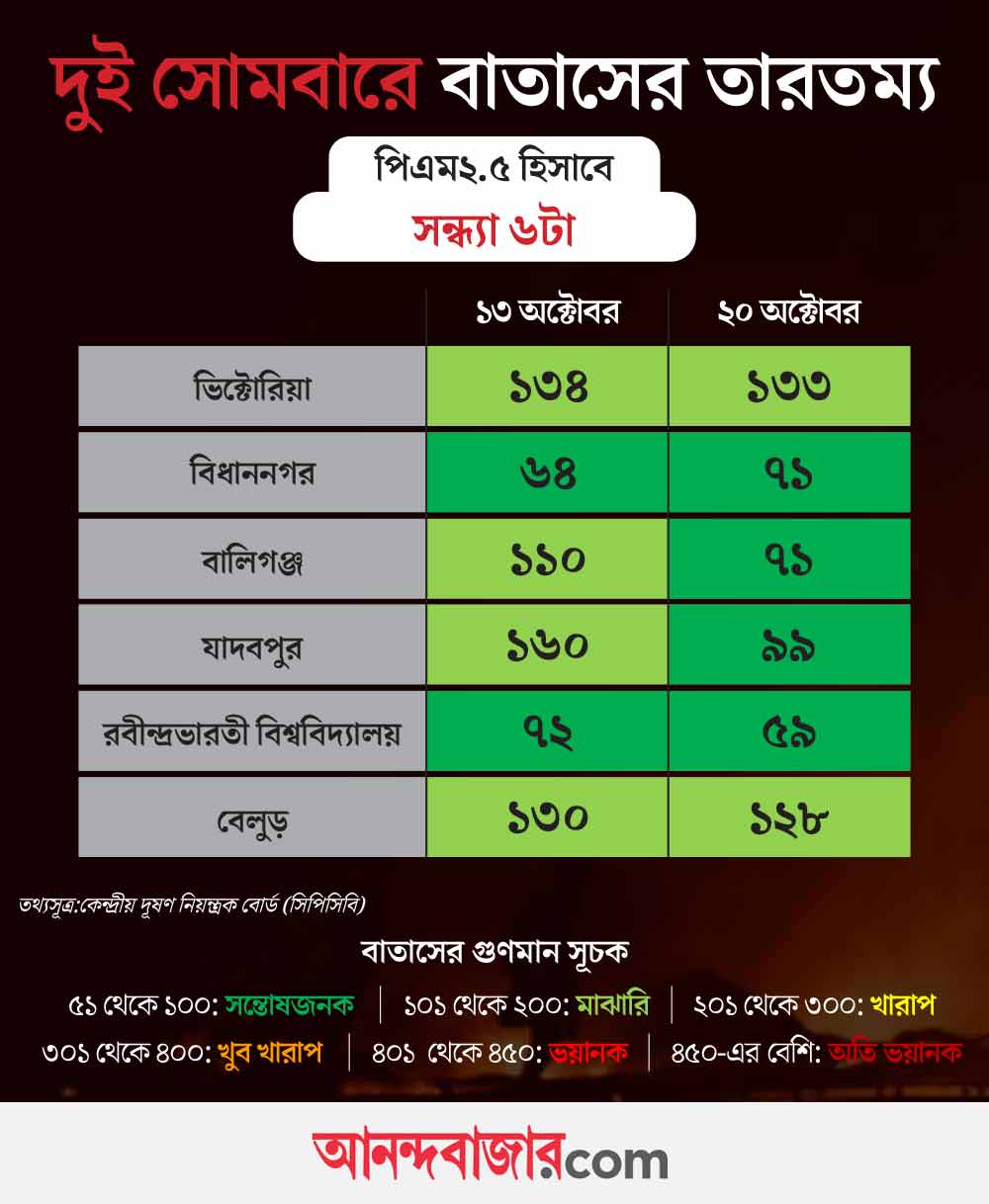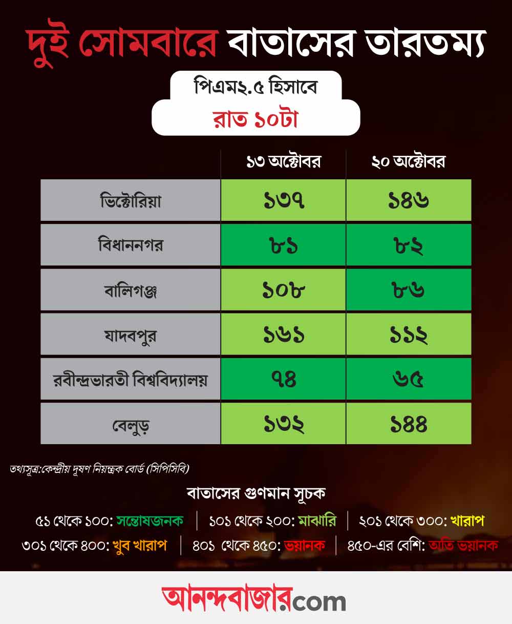 গত সোমবার অর্থাৎ ১৩ অক্টোবর এবং কালীপুজোর দিন অর্থাৎ ২০ অক্টোবর বিকেল ৫টায় বাতাসের গুণগত মানের তুল্যমূল্য হিসাব দেওয়া হল।