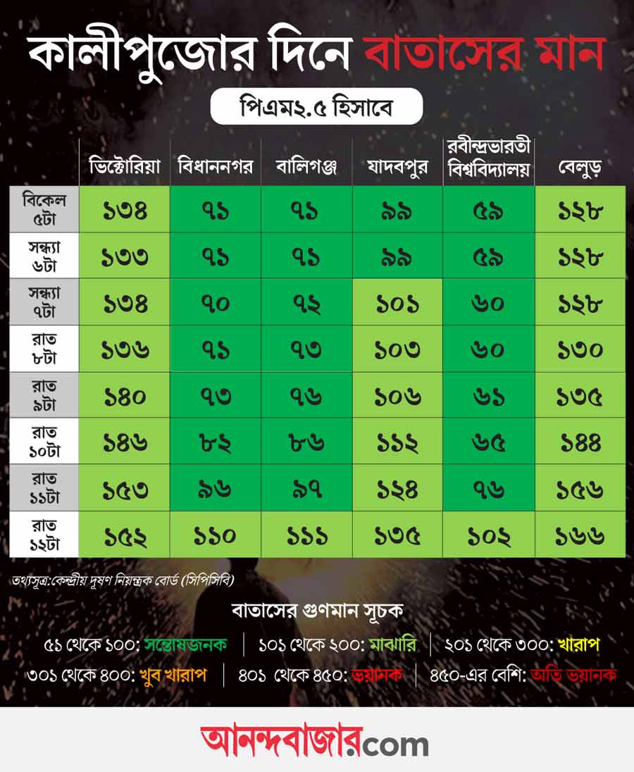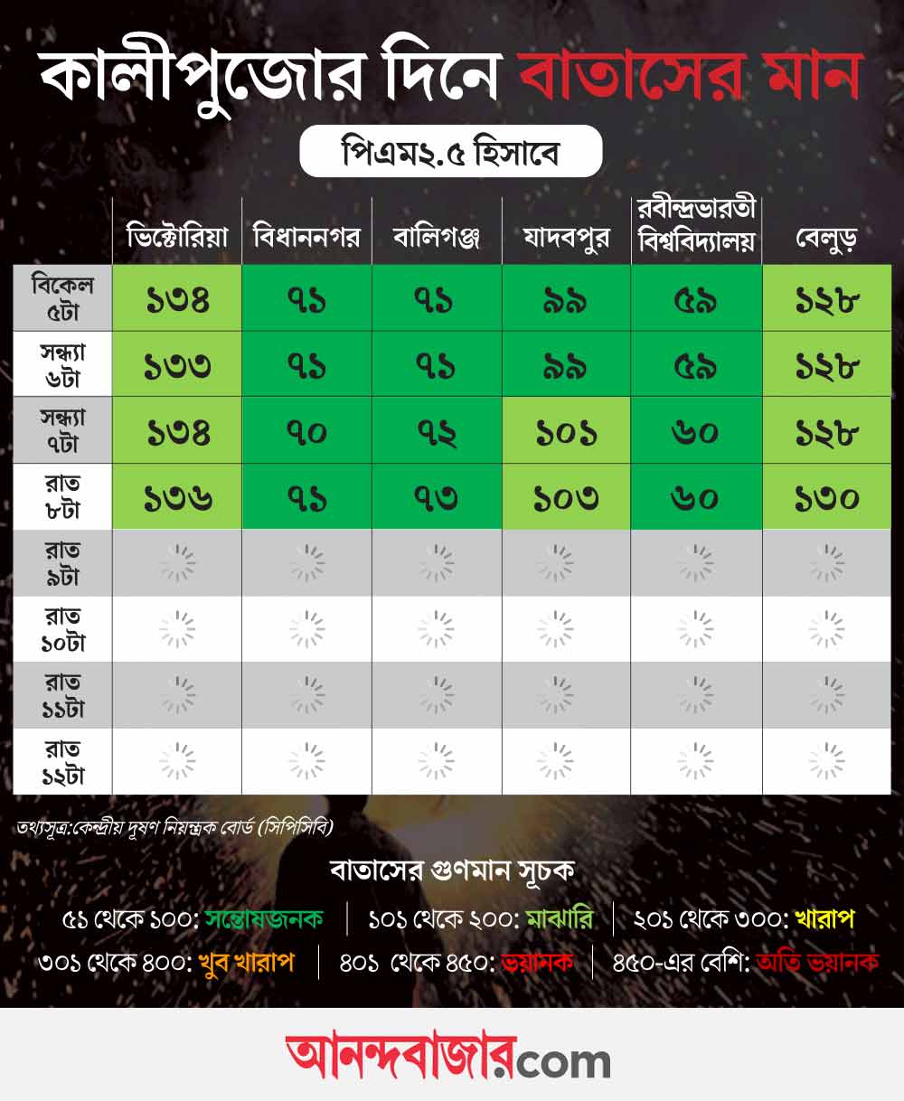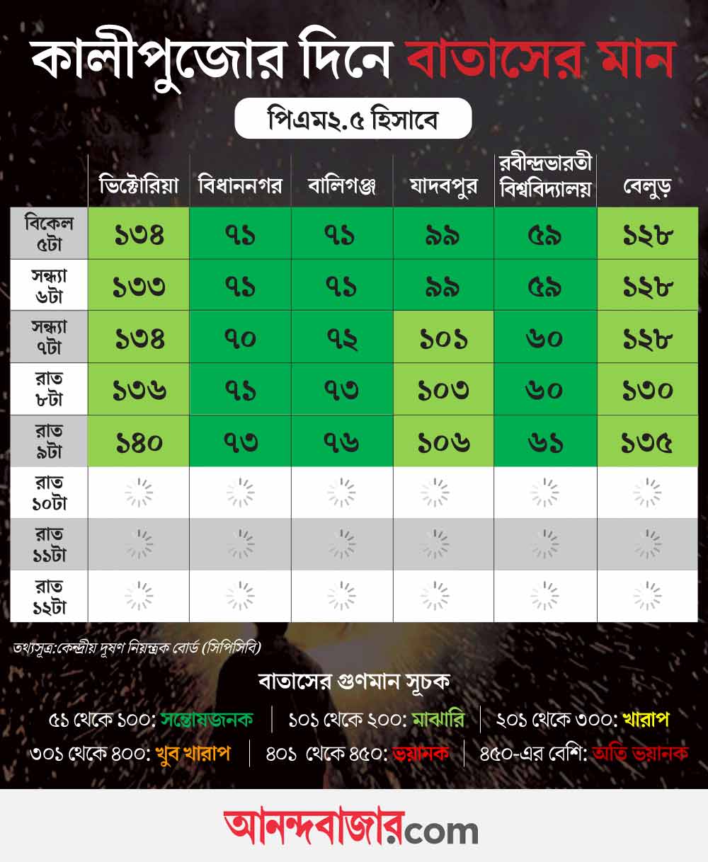 দীপাবলিতে দিল্লির বেশ কয়েকটি এলাকার তুলনায় কলকাতা এবং বিধাননগর এলাকার দূষণের মাত্রা অনেকটাই বেশি। বাতাসের গুণমান সূচকে গড় হিসাব সন্তোষজনক হলেও, ১১টার পর দূষণের মান তাৎক্ষণিক ভাবে অনেকটাই বেশি। কলকাতা, সল্টলেকের একিউআই ৩৫০ ছুঁইছুঁই।