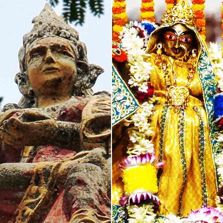 প্রতি বৃহস্পতিবার তাঁর আরাধনা ঘরে ঘরে। ভাদ্র, পৌষ ও চৈত্রের সংক্রান্তি তিথিতেও হয় শস্য-সম্পদের দেবী লক্ষ্মীর পুজো। কোজাগরী পূর্ণিমা আর দীপাবলি-অমাবস্যার বিশেষ পুজো তো আছেই। এক সময় গৃহশিখরেও লক্ষ্মীর মূর্তি বসাতেন কলকাতাবাসীরা, একটি নমুনা এখনও দেখা যাবে শশিভূষণ দে স্ট্রিটে (ছবিতে বাঁ দিকে)। গৃহে গৃহে পুজো পান বলেই কি আলাদা করে এ শহরে লক্ষ্মীর মন্দির নেই তেমন? কলাগাছের ডোঙা দিয়ে তৈরি বাণিজ্যতরীর পুজো থেকে শুরু করে নারকেলকে শাড়ি পরিয়ে লক্ষ্মীরূপে পূজা— নানা লোকাচার মিশে আছে লক্ষ্মীপুজোয়। চিত্রিত সরায় লক্ষ্মীর আবাহন, তাতেও কত না ভিন্নতা। শোভাবাজার দেব বাড়ির গোপীনাথ ভবনে কোজাগরী পূর্ণিমায় গৃহলক্ষ্মী রাধারানিই পুজো পান লক্ষ্মীরূপে (ডান দিকের ছবি), একশো আট পদ্মে। লক্ষ্মীলাভ তথা রুটি-রুজির বিচিত্র পথের মতো লক্ষ্মীপুজোর রীতিতেও বৈচিত্র অন্তহীন।