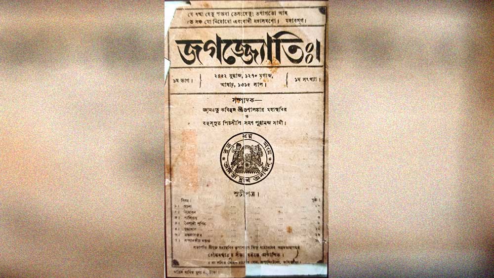 কলকাতায় বৌদ্ধ সংস্কৃতি চর্চার সঙ্গে অবিচ্ছেদ্য দু’টি নাম, অনাগারিক ধর্মপাল ও কৃপাশরণ মহাথের। প্রথম জন ‘মহাবোধি সোসাইটি অব ইন্ডিয়া’-র প্রতিষ্ঠাতা, দ্বিতীয় জন ১৮৯২ সালে স্থাপনা করেছিলেন বেঙ্গল বুদ্ধিস্ট অ্যাসোসিয়েশন ‘বৌদ্ধ ধর্মাঙ্কুর সভা’। প্রতিষ্ঠানের জার্নাল জগজ্জ্যোতি-র প্রথম প্রকাশ ১৯০৮ সালে (ছবিতে প্রথম সংখ্যার প্রচ্ছদ)। ১২৫ বছর পেরিয়ে এসেছে মধ্য কলকাতার এই প্রতিষ্ঠানটির, সেই উপলক্ষে জার্নালের একটি বিশেষ সংখ্যা প্রকাশিত হচ্ছে আগামী ৩১ ডিসেম্বর, বিশিষ্ট বৌদ্ধ ধর্ম ও সংস্কৃতিবেত্তা বেণীমাধব বড়ুয়ার ১৩২তম জন্মদিনে। দলাই লামা, বেণীমাধব বড়ুয়া, স্বামী প্রজ্ঞানানন্দ, গোপালকৃষ্ণ গাঁধী-সহ প্রাজ্ঞজনের লেখায় সমৃদ্ধ সংখ্যাটি। সম্পাদনায় হেমেন্দু বিকাশ চৌধুরী, ভূমিকা লিখেছেন জহর সরকার।