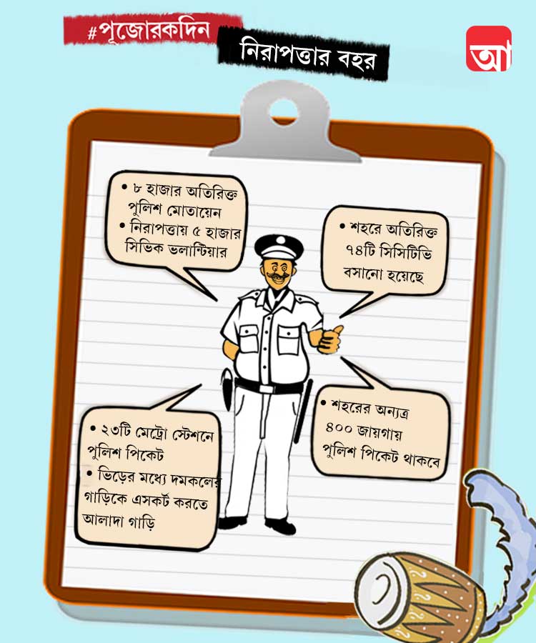 পঞ্চমী থেকেই শহরে নামছে অতিরিক্ত ৮ হাজার পুলিশ। কোনও সমস্যায় পড়লে লালবাজার কন্ট্রোল রুমে ফোন করতে পারেন আপনি৷ এ ছাড়াও রয়েছে কলকাতা পুলিশের ডায়াল ১০০। শহরে বিভিন্ন প্রান্তে ৪০০টি জায়গায় পুলিশ পিকেট করা হয়েছে। থাকবেও। এ ছাড়াও টহল দেবে ২৪টি এইচআরএফএস, ২৫টি ডিভিশনাল মোবাইল ভ্যান। নজরমিনার করা হয়েছে ৪৬টি।