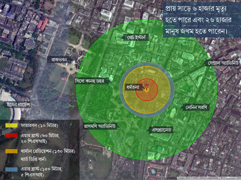 নিউক-ম্যাপ যে হিসেব দিচ্ছে, তাতে ধর্মতলায় মোআব ফেলা ৬ হাজার ৫০০-রও বেশি মানুষের প্রাণ যেতে পারে। জখম হতে পারেন প্রায় ২৬ হাজার মানুষ।