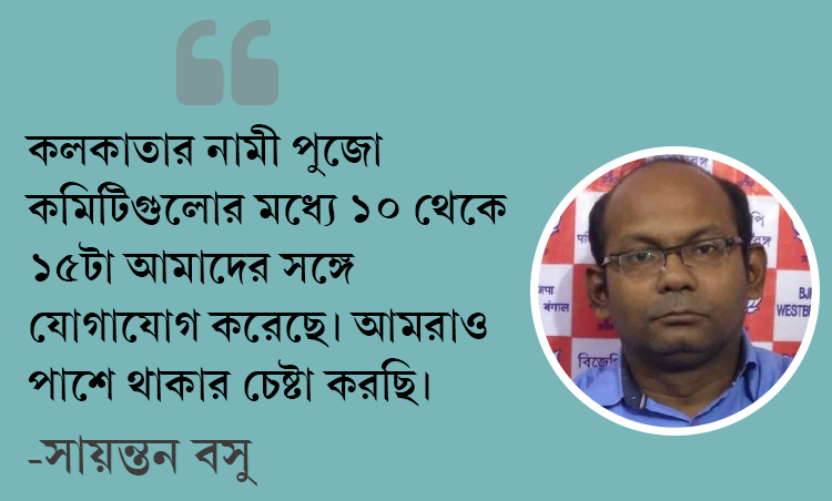 ওই সব পুজো কমিটির সঙ্গে যে বিজেপি নেতৃত্বের কথা শুরু হয়েছে, তা মেনে নিয়েছেন রাজ্য বিজেপির অন্যতম সাধারণ সম্পাদক সায়ন্তন বসু। তাঁর কথায়, ‘‘শুধু ওই দুটো পুজো কমিটি নয়, কলকাতার নামী পুজো কমিটিগুলোর মধ্যে ১০ থেকে ১৫টা আমাদের সঙ্গে যোগাযোগ করেছে। আমরাও পাশে থাকার চেষ্টা করছি। ওঁরা ঠিক কী চান, কী ধরনের সাহায্য চান, তা আমাদের পক্ষে করা সম্ভব কি না, আমরা তা গুরুত্ব দিয়েই ভাবছি।’’
