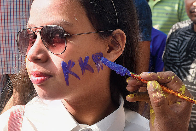 রেড রোডের এক দিকের ফুটপাত থেকে অন্য পারে যেতে দড়ি পড়েছে। দড়ি ধরে দাঁড়িয়ে দুই পুলিশকর্মী। পিছনে বেগুনি রঙা পোশাকের ভিড়। বাবার কাঁধে চড়ে বসা এক শিশু ভিড়ের মধ্যে থেকেই বলল, ‘‘ঠাকুর দেখব। অসুর।’’ মাথায় বেগুনি রিবন বাধা উন্মত্ত ভিড় চেঁচিয়ে উঠল, ‘‘কেকেআর! কেকেআর!’’ শিশুর ঠাকুর দেখার উৎসাহ নিমেষে উধাও। ভয়ে চোখ জড়োসড়ো।