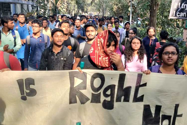 ছাত্রসংসদের দাবিতে পড়ুয়াদের মিছিল। নিজস্ব চিত্র।