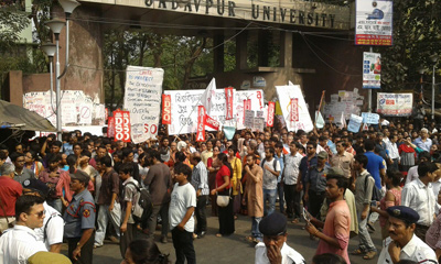 জেএনইউ কাণ্ডকে ঘিরে কয়েক দিন ধরেই উত্তপ্ত যাদবপুর বিশ্ববিদ্যালয়। কানহাইয়া কুমারের গ্রেফতারির প্রতিবাদে মঙ্গলবার সন্ধ্যায় মিছিল করেন যাদবপুর বিশ্ববিদ্যালয়ের পড়ুয়াদের একাংশ। সেই মিছিল থেকে ভারতবিরোধী স্লোগান তোলেন কেউ কেউ। তাতেই উত্তপ্ত হতে শুরু করে পরিস্থিতি। মিছিলের আয়োজকরা কোনওভাবেই দেশবিরোধী স্লোগানকে সমর্থন করেননি। তার নিন্দাই করেছেন। কিন্তু পরিস্থিতির সুযোগ নিতে ময়দানে নামে এবিভিপি ও বিজেপি। বুধবার যাদবপুর বিশ্ববিদ্যালয় চত্বরে তাণ্ডব চালায় এক দল পড়ুয়া। জেএনইউ-কাণ্ডের নিন্দায় যে পোস্টার, ব্যানার লাগানো হয়েছিল, সে সব ভেঙে দেওয়া হয়। তাতেও ক্ষান্ত হয়নি বিজেপি-এবিভিপি। বৃহস্পতিবার মিছিল নিয়ে যাদবপুর বিশ্ববিদ্যালয়ে ঢোকার কথা ঘোষণা করেন বিজেপি নেতারা।