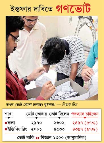 কলা বিভাগের ২৯৭০ জন পড়ুয়ার মধ্যে ভোটার ছিলেন ২৬০২ জন। তার মধ্যে ২৪৯৭ জন উপাচার্যের পদত্যাগ চান। ইঞ্জিনিয়ারিং-এ মোট ৫০৮১ পড়ুয়ার মধ্যে ৪৫৩৩ জন ভোটে অংশ নিয়েছেন। ৪৩৯৭ জন পদত্যাগের পক্ষে ভোট দিয়েছেন। বিজ্ঞান বিভাগে পরীক্ষা শুরু হওয়ার কারণে সেখানে ভোটাভুটি স্থগিত আছে। ওই বিভাগে কমবেশি ১৩০০ ছাত্রছাত্রী রয়েছেন। সুতরাং দেখাই যাচ্ছে, কমবেশি মোট ৯৩০০ ছাত্রছাত্রীর মধ্যে এখনই সংখ্যাগরিষ্ঠ ৬৮৮৯ জনের মত গিয়েছে অভিজিৎবাবুর বিরুদ্ধে। আন্দোলনকারী ছাত্রছাত্রীদের দাবি, বিজ্ঞান বিভাগেও কমবেশি ১৩০০ ছাত্রছাত্রীর শতকরা ৯৫ ভাগেরই সমর্থন তাঁদের দিকে।