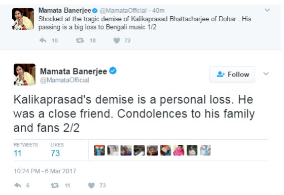 কালিকাপ্রসাদের মৃত্যুতে মুখ্যমন্ত্রী মমতা বন্দ্যোপাধ্যায়ের টুইট।