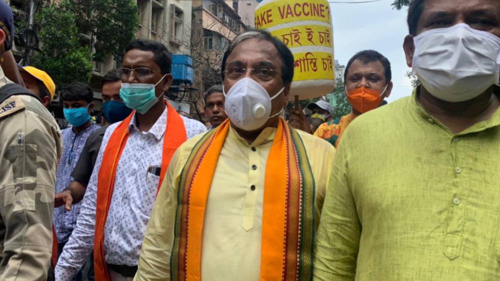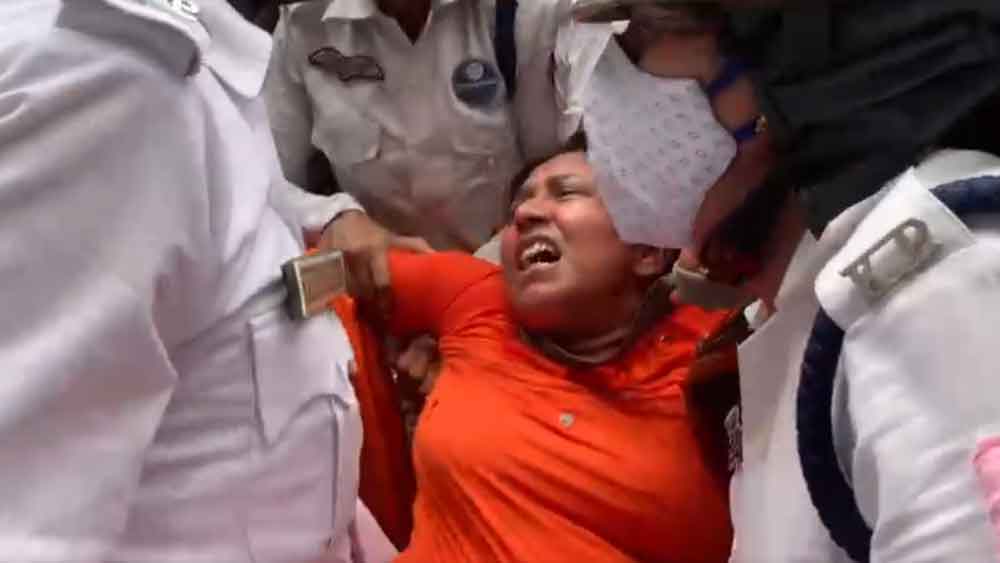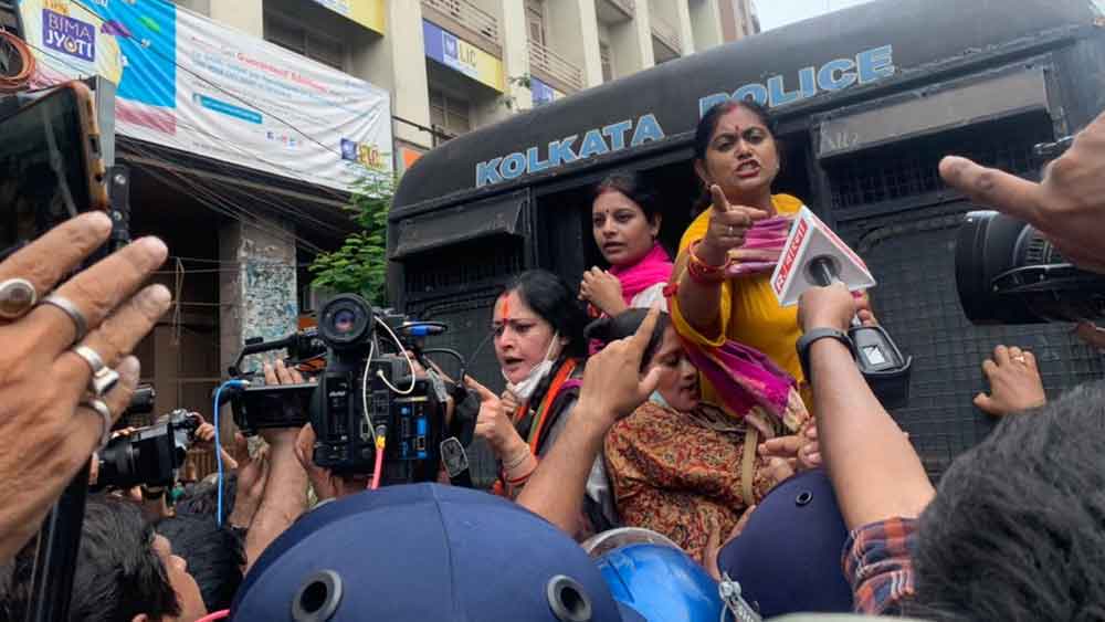 পুলিশের সঙ্গে ধস্তাধস্তিতে এক মহিলা বিজেপি কর্মী অসুস্থ হয়ে পড়েন। রাস্তায় পড়ে যান তিনি। তাঁর চিকিৎসা করেন বিজেপি কর্মীরাই।