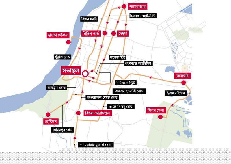 লালবাজার থেকে জানানো হয়েছে, শুক্রবার সকাল আটটা থেকে রাত আটটা পর্যন্ত কোনও ধরনের পণ্যবাহী গাড়ি শহরে প্রবেশ করবে না। সভাস্থলের কাছে ট্রাম চলাচল বন্ধ থাকবে। সেই সঙ্গে মিছিল এবং সমাবেশের জন্য মূল রাস্তা বন্ধ থাকলে বিকল্প রাস্তা দিয়ে যান চলাচল করবে। পুলিশ জানিয়েছে, গাড়ি জমায়েত করা যাবে ময়দান, হেস্টিংস, চিত্তরঞ্জন অ্যাভিনিউ ও বি বি গাঙ্গুলি স্ট্রিট, কিড স্ট্রিট, স্ট্র্যান্ড রোড, মেয়ো রোড, পলাশি গেট, গঙ্গাসাগর ময়দান, এপিসি রোডের উত্তর দিক, সিআইটি রোড, মৌলালি থেকে মল্লিকবাজার, জওহরলাল নেহরু রোড এবং আশুতোষ মুখার্জি রোডে। ভিআইপি-রা গাড়ি রাখবেন পার্কোম্যাট এবং বিধানসভায়।