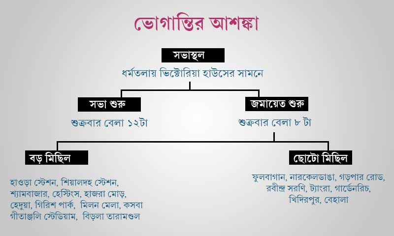এ বার ধর্মতলার সমাবেশের জন্য কলকাতা শহরের বিভিন্ন জায়গা থেকে মোট ২৯টি মিছিল ধর্মতলা অভিমুখে আসার কথা। তার মধ্যে ইএম বাইপাস দিয়েও কিছু মিছিল আসবে। অন্যান্য বার হাওড়া, শিয়ালদহ স্টেশন চত্বর এবং বড়বাজারের ধর্মশালায় সমাবেশে আগত কর্মী-সমর্থকদের থাকার ব্যবস্থা হয়। এ বার তার পাশাপাশি মিলনমেলা প্রাঙ্গন এবং কসবার গীতাঞ্জলি স্টেডিয়াম কর্মী-সমর্থকদের থাকার জন্য খুলে দেওয়া হয়েছে। ফলে, আগামিকাল শুক্রবার গোটা কলকাতাতেই বিপুল প্রভাব পড়বে। যা আন্দাজ করে তৃণমূলের সর্বভারতীয় সাধারণ সম্পাদক সুব্রত বক্সী বৃহস্পতিবার বলেছেন, ‘‘মানুষের কিছু সমস্যা হবে। তার জন্য আগাম দুঃখপ্রকাশ করছি।’’