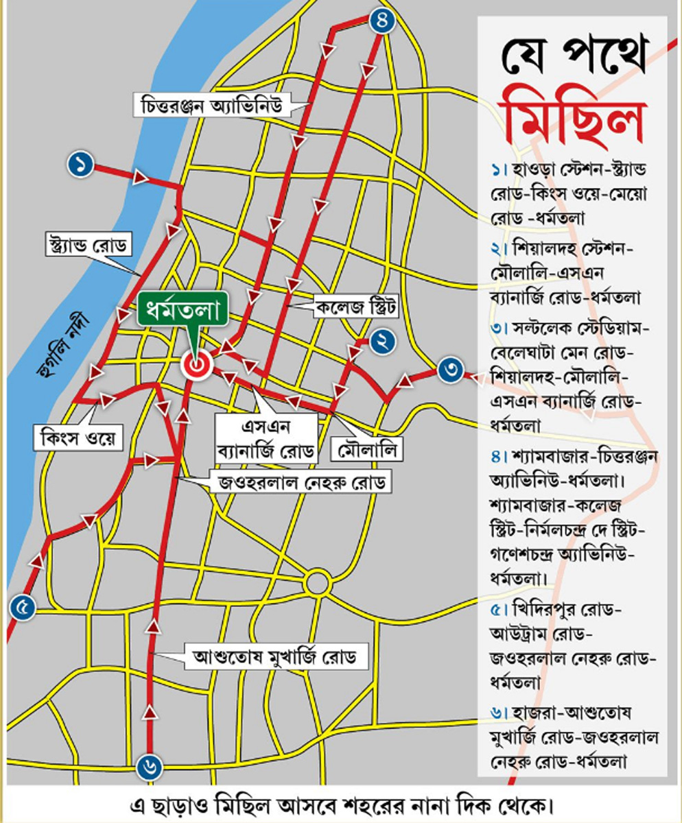 সকাল ৮টা থেকেই মিছিল আসতে শুরু করেছে ধর্মতলার মোড়ে তৃণমূলের শহিদ মঞ্চে। লালবাজারের হিসাব অনুযায়ী, সব মিলিয়ে ঢুকবে ১০ হাজারেরও বেশি গাড়ি। জমায়েত, মিছিল এবং পার্কিংয়ের জেরে সকাল ১০টার পর থেকেই স্তব্ধ হয়ে যেতে পারে বেশ কিছু রাস্তা। বিকল্প পথে গাড়ি ঘুরিয়ে দেওয়া হতে পারে। বাড়ি থেকে বেরোনোর আগে জেনে নিন কোন কোন রাস্তা এড়িয়ে চললেই ভাল। নীচে দেওয়া মানচিত্রে দেখে নিন ঠিক কোন কোন রাস্তা দিয়ে মিছিল আসার কথা। এড়িয়ে চলুন এই রাস্তাগুলো: