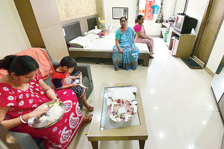 পুজোর দিন হোটেলের ঘরে বসেই কাটালেন দুর্গা পিতুরি লেনের কয়েক জন বাসিন্দা। রবিবার। ছবি: বিশ্বনাথ বণিক